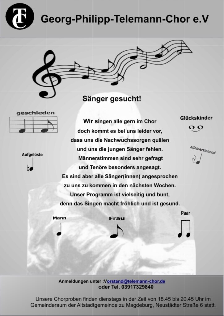Mitsingen Chorprobe dienstags 18:45 – 20:45 Uhr im Gemeinderaum der Altstadtgemeinde, Neustädter Str. 6, 39104 Magdeburg